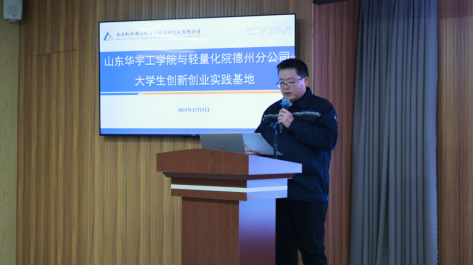 会前,双方领导实地参观了北京机科国创轻量化科学研究院有限公司德州分公司,详细了解了公司运营情况,并针对产学研合作、强化实践基地共建等方面交换了意见,达成系列共识。随后双方举行了签约揭牌仪式,仪式前北京机科国创轻量化科学研究院有限公司德州分公司副总经理陈国松发表致辞。在双方的共同见证下,北京机科国创轻量化科学研究院有限公司德州分公司副总经理陈国松与公司董事长助理魏东坡为老员工创新创业实践基地签署合作协议,并共同为老员工创新创业实践基地揭牌。