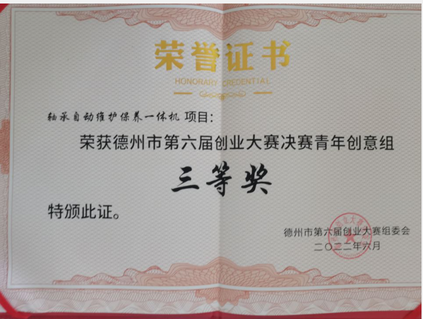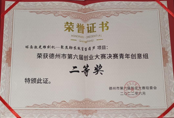 6月9日,德州市第六届创业大赛决赛在德州市人力资源市场主楼三楼会议室举行,经过激烈角逐,公司《球面激光雕刻机—聚焦助农致富宝葫芦》项目以第二名的成绩获得青年创意组二等奖,《轴承自动维护保养一体机》项目以第4名的成绩获得三等奖。此外,德州市人民政府常务副市长与公司员工亲切交谈并对获奖项目给予肯定。